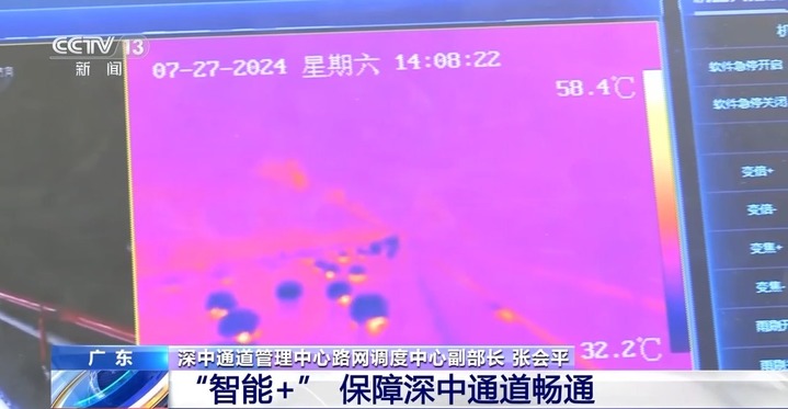 深中通道管理中心路网调度中心副部长 张会平:屏幕上就是巡检机器人拍摄的画面,它是按设定的路线对隧道内的交通状况以及一些异常事件,进行自动检测和报警处置,红外线画面的可以自动监测到隧道内的温度,一旦有状况会自动提示。