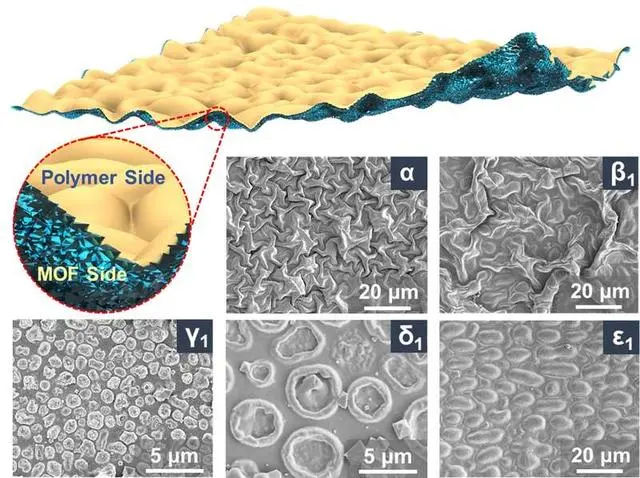 在合成金属有机框架化合物的过程中,研究团队通过改变反应试剂的浓度、聚合物覆盖层的厚度,制备出5类13种图案,获得了形貌可调的具有皱褶结构的金属有机框架化合物薄膜。