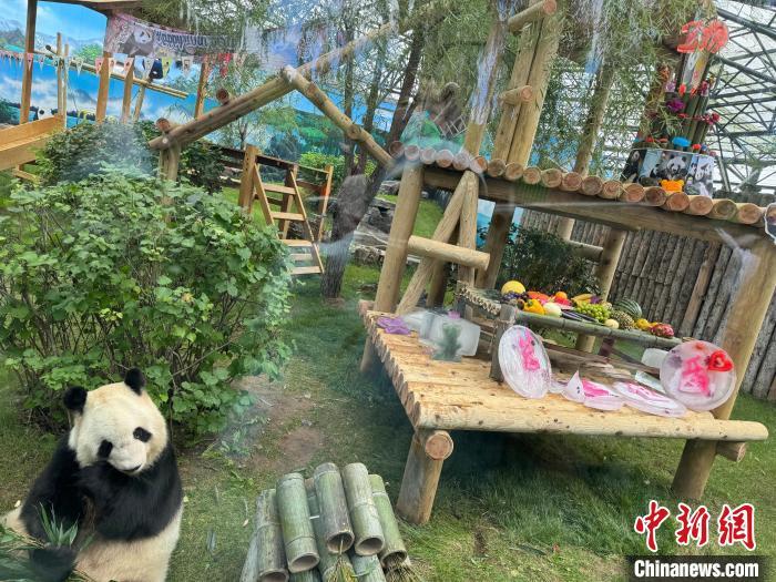 此时,在现场有人自发地唱起了《祝你生日快乐》的歌曲,似乎听懂人言的这对大熊猫开始满意地点头,接着自顾自地大饱口福。