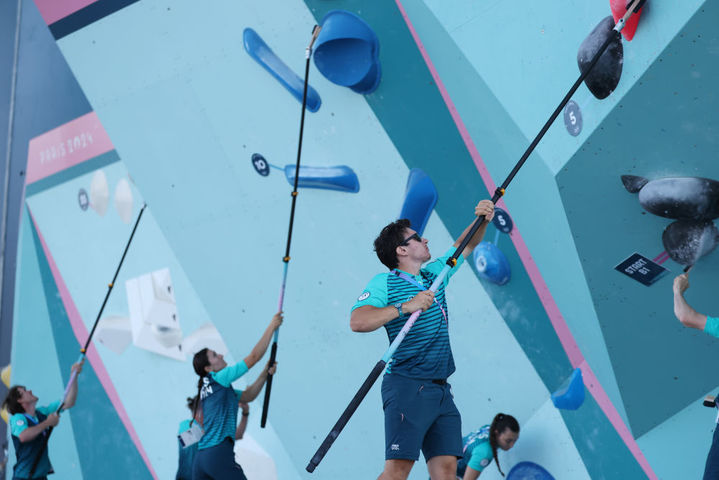 8月6日,志愿者在工作中。当日,巴黎奥运会攀岩女子全能两项半决赛攀石赛在勒布尔歇运动攀岩中心举行。新华社记者 高静 摄