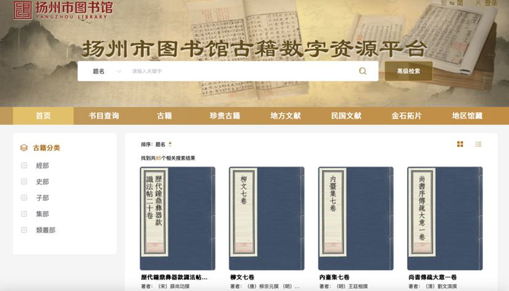 扬州市图书馆拥有丰富的古籍资源,收藏宋至民国间历朝刻本、稿抄本、活字本、石印本等13.2万册。其中善本古籍1.4千种、1.5万册左右,编入《中国古籍善本书目》的有193部,入选《国家珍贵古籍名录》的有75部,入选《江苏省珍贵古籍名录》的有196部,被评为“全国古籍重点保护单位”“江苏省古籍重点保护单位”。