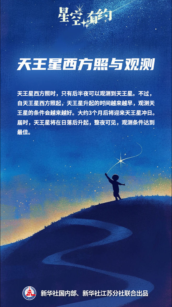 天王星西方照时,只有后半夜可以观测到天王星。不过,自天王星西方照起,天王星升起的时间会越来越早,观测天王星的条件变得越来越好。大约3个月后,地球将来到太阳和天王星之间,天王星和太阳的地心视黄经相差180度,即为天王星冲日。届时,天王星将在日落后升起,整夜可见,观测条件达到最佳。据测算,今年11月17日将迎来天王星冲日。