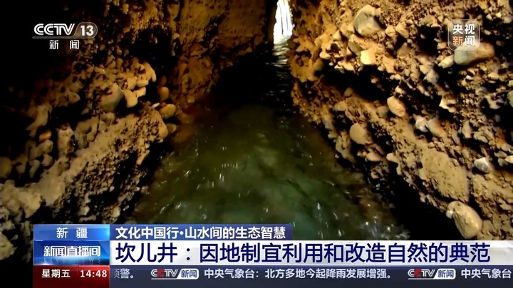 总台央视记者王晨:在坎儿井的每一条地下暗渠中,清澈的渠水都是自动流淌的,堪称古代的自来水系统。这是因为吐鲁番盆地海拔较低,而盆地北部作为水源地的天山山脉平均海拔在5000米左右,冰川融水进入地下之后顺着北高南低的地势形成自流井,体现出古人因势利导的聪明智慧。
