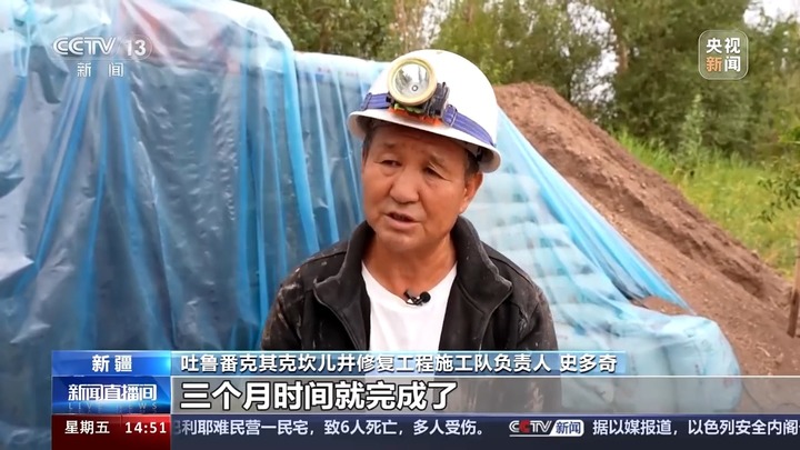 吐鲁番克其克坎儿井修复工程施工队负责人史多奇:过去,挖掘200米需要一年多的时间,但是我们现在,三个月时间就完成了。