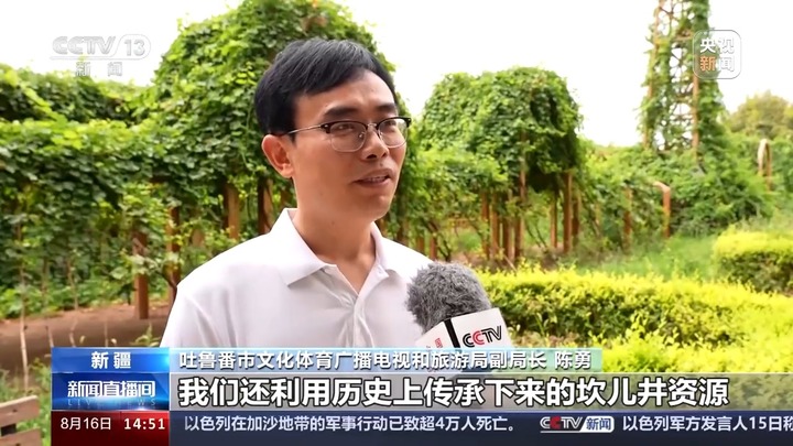 吐鲁番市文化体育广播电视和旅游局副局长陈勇:除此之外,我们还利用历史上传承下来的坎儿井资源,开设了坎儿井游乐园、民俗园、传承区等特色旅游景区、景点,向国内外游客系统展示了坎儿井的原理结构、开挖技艺、文化内涵以及其中蕴含的生态智慧。凝聚着各族群众智慧的坎儿井,现在已经成为国内外游客到吐鲁番必去的热门“打卡”地。