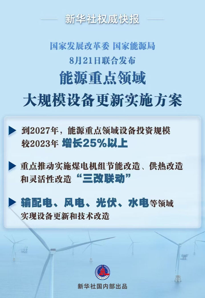 国家发展改革委、国家能源局8月21日联合发布《能源重点领域大规模设备更新实施方案》,推动能源重点领域大规模设备更新和技术改造,重点任务包括推进火电设备更新和技术改造、推进输配电设备更新和技术改造、推进风电设备更新和循环利用、推进光伏设备更新和循环利用、稳妥推进水电设备更新改造、推进清洁取暖设备更新改造、以标准提升促进设备更新和技术改造。