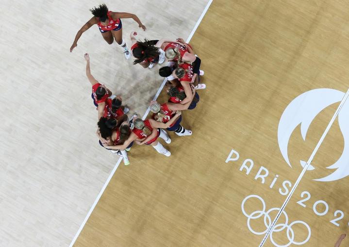 8月6日,美国队庆祝胜利。当日,在巴黎奥运会女子排球四分之一决赛中,美国队3比0战胜波兰队,晋级四强。新华社记者 郭昱 摄