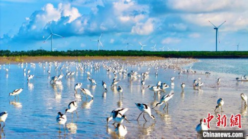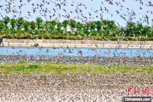 中新网南京9月10日电(谷华)又到一年候鸟秋季迁徙时。近日,江苏沿海迎来候鸟迁徙高峰期,黄海湿地优质的生态环境和丰富的食物资源,成为鸟类栖息天堂。