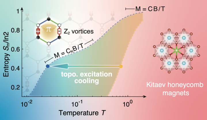 阻挫量子磁体通常具备较高的磁性离子密度、强烈的自旋涨落以及磁激发带来的增强热导等,并且材料结构稳定,可作为新型的磁制冷工质,有望实现极低温的固态制冷。吉塔耶夫量子自旋液体由于阻挫效应与量子涨落的共同作用,即便在远低于相互作用能标的低温甚至零温时也不会形成磁有序,其低能拓扑激发会携带巨大的低温熵,通过外场的有效调控能够实现显著的磁卡效应,进而实现拓扑激发极低温制冷,这为探索新型固态制冷机制开辟了一条新途径。