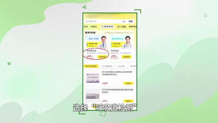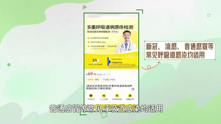 打开手机外卖APP,首页点击看病买药,点击居家快检,选择“呼吸道检测-立即检测”,跳转到微信,选择标准版(这里显示新冠、流感、普通感冒等常见呼吸道感染均适用),点击购买服务,选择上门地址,点击立即支付,等待送检员上门。