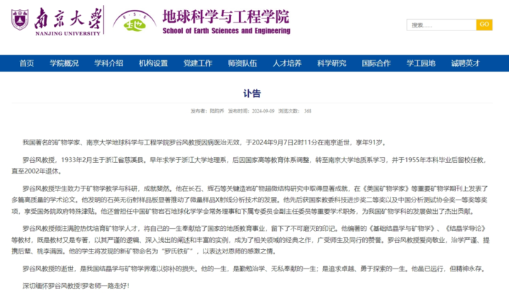 9月9日,南京大学地球科学与工程学院发布讣告:我国著名的矿物学家、南京大学地球科学与工程学院罗谷风教授因病医治无效,于2024年9月7日2时11分在南京逝世,享年91岁。