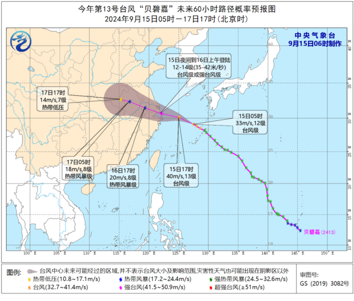 大风预报:9月15日08时至16日08时,东海大部、黄海南部、浙江东北部、上海、江苏东南部将有6-8级、阵风9-10级的大风,东海北部部分海域、上海沿海、江苏东南部沿海、杭州湾、长江口区、舟山群岛附近海域将有9-11级、阵风12-13级的大风,“贝碧嘉”中心经过的附近海域或地区风力可达12-14级、阵风15-16级。