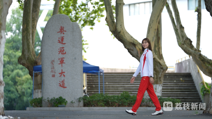 王赐月走在南京体育学院奥运冠军大道上 荔枝新闻拍摄