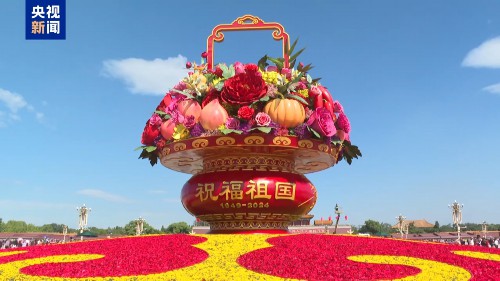 “祝福祖国”大型花坛以喜庆的蔬果花篮为主景,花坛顶高18米,篮体高16米,篮盘直径12米。花坛底部直径45米,为如意图案,寓意吉祥如意、国泰民安。今年的花坛首次以“蔬果花篮”呈现,篮内选取了美好寓意的蔬果和花卉,体现“蔬果飘香,繁花似锦”。