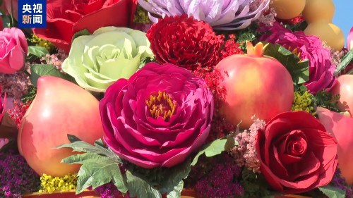 北京市园林绿化局城镇绿化处二级调研员 宋学民:首次增加了蔬菜,变成了蔬果花篮,里面加上了富有吉祥寓意的南瓜、葫芦,还有红辣椒,红红火火,象征着丰收。再加上蔬菜、水果和鲜花,构成了蔬果花篮,寓意繁花似锦,蔬果飘香。