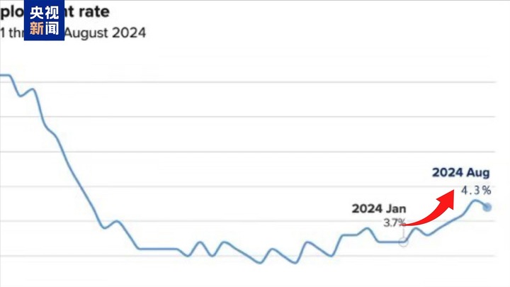 在美国财经媒体CNBC看来,7月份是“滑铁卢”的开始。当月,美国仅创造了8.9万个就业岗位,远低于17.5万的预期以及去年18.4万的同期数值。与此同时,美国的失业率上升至4.3%,比今年年初上升了0.6%。