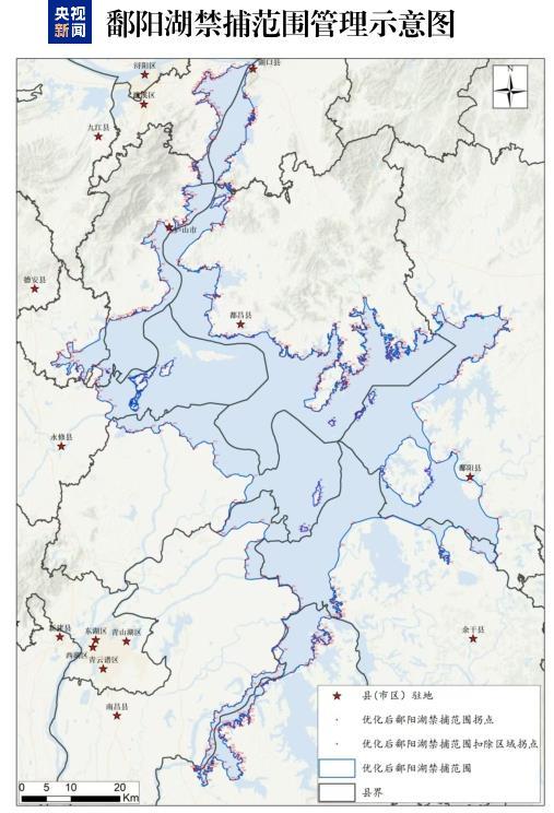优化调整的鄱阳湖禁捕范围,以鄱阳湖最高水位,即湖口水位22.48米对应的鄱阳湖水域为外围控制线,由558个主要拐点连成的水域、湖滩洲地组成,总面积为3093.37平方公里。禁捕范围分属湖口县、都昌县、鄱阳县、余干县、进贤县、南昌县、南昌市新建区、永修县、共青城市、庐山市及九江市濂溪区等11个鄱阳湖滨湖县(市、区)。相较于之前,优化调整后的鄱阳湖禁捕范围扩大了34.63平方公里,其中新增面积44.28平方公里,优化调出陆域面积9.65平方公里。