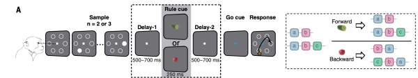 在该研究中,两只猕猴被训练执行一个延迟序列排序任务。它们需要记忆屏幕中出现在不同序列位置的圆点图案,随后会在系统提示下对序列进行正向或逆向的排序,最后通过触摸屏幕来汇报结果。研究者们将微驱动电极阵列植入猕猴的前额叶皮层,记录了数千个神经元的电活动,并对结果进行数学描述,分析其中表现出来的模式。