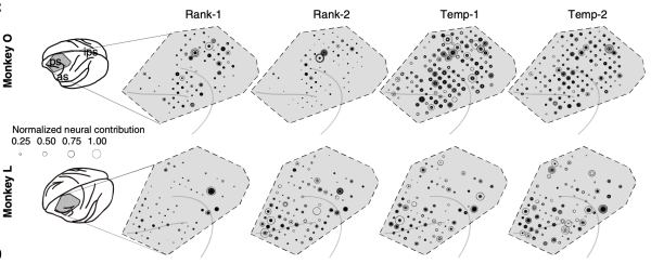 在两只猕猴脑中的次序子空间与临时子空间中,不同神经元的标准化参与比率(NPR)。图片来源:《科学》杂志
