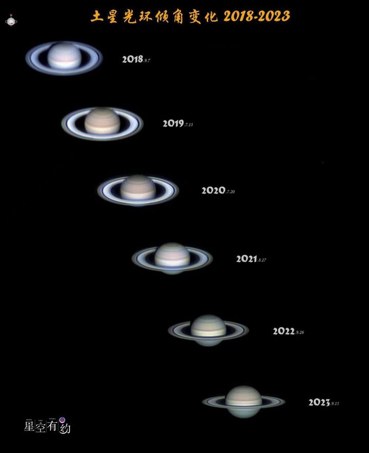 土星最引人注目的特征是它巨大的光环,在望远镜中看起来十分漂亮。从地球上看,在土星约29.5年的公转周期中,我们每年所见的土星光环倾角是不同的,每15年左右,土星光环会以最大倾角朝向地球,我们能更清楚地看到土星的光环;同样每隔15年左右,当土星光环侧面正对地球时,我们会看到光环“消失”了。当然,这并不是真的“消失”,而是由于光环很薄,当环面与我们视线的方向平行时,光环则很难被观测到。