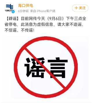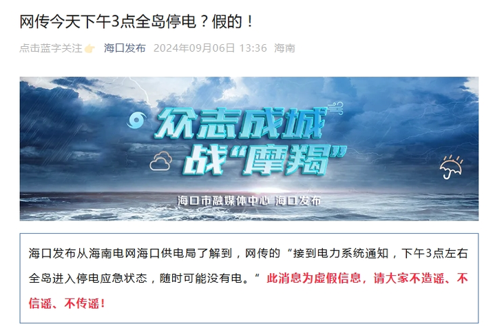 荔枝新闻讯 据“海口发布”微信公众号9月6日消息,海口发布从海南电网海口供电局了解到,网传的“接到电力系统通知,下午3点左右全岛进入停电应急状态,随时可能没有电。”此消息为虚假信息,请大家不造谣、不信谣、不传谣!