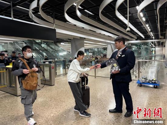香港西九龙站工作人员向旅客赠送大熊猫迷你玩偶等纪念品。
