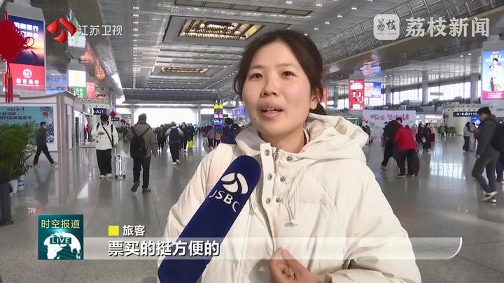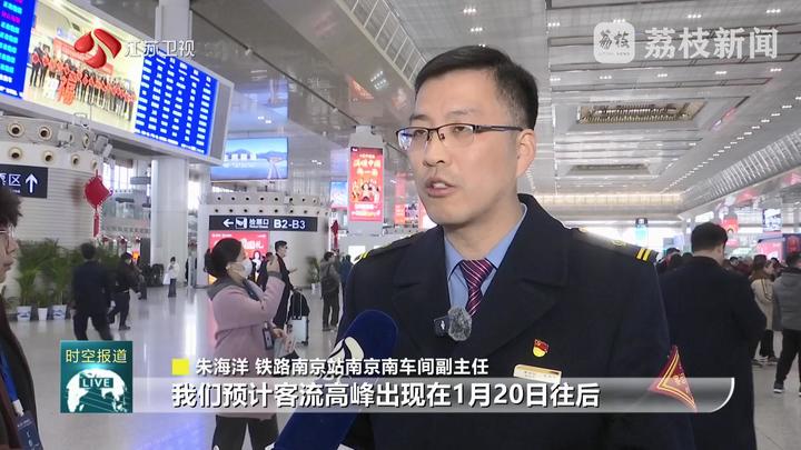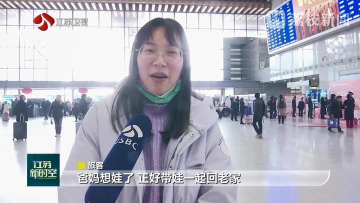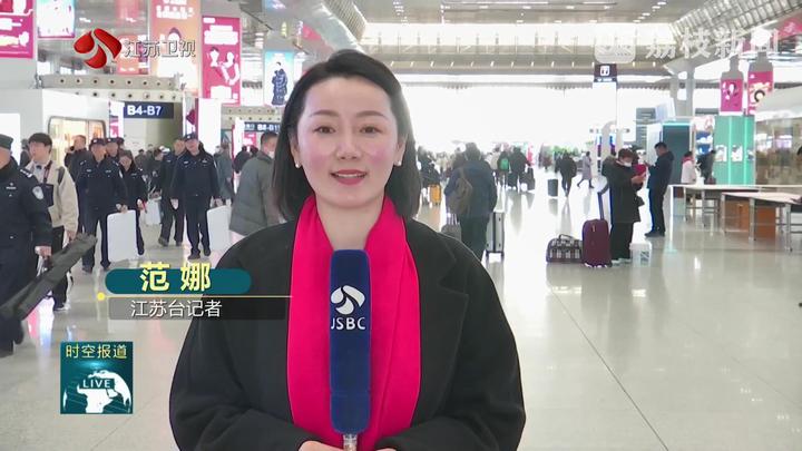 江苏台记者范娜说:“现在,我所在的是南京南站。今天,这里的客流量相较于平日有明显的提升。预计春运首日,南京南站发送的客流量将达到15万人次。”