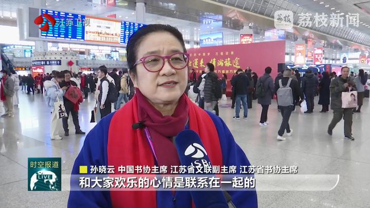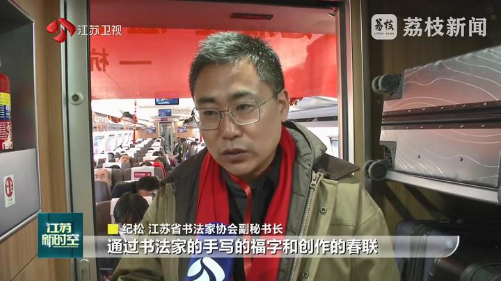 江苏省书法家协会副秘书长纪松说:“通过书法家的手写的福字和创作的春联,通过高铁在春运的头一天,能够让大家感受到我们祖国经济的繁荣发展、文化的昌盛。”