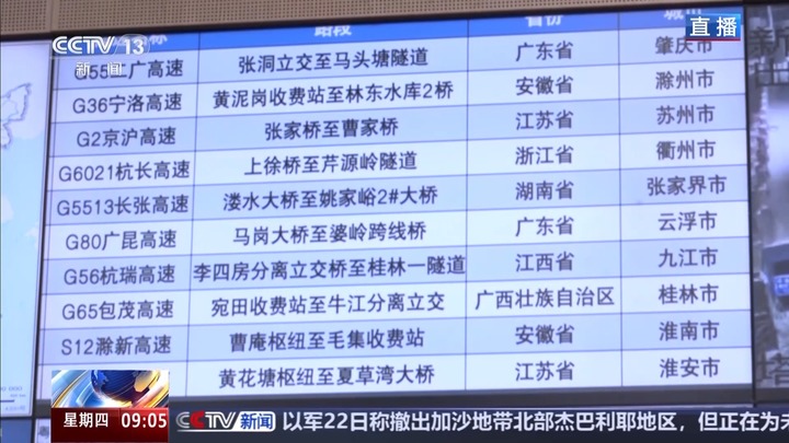 可以通过身后的大屏来关注这几天车流量较大的局部路段。昨天有部分网友反馈许广高速湖南段存在缓行,很长时间没有动,此刻我们看到的是许广高速湖南段的画面。
