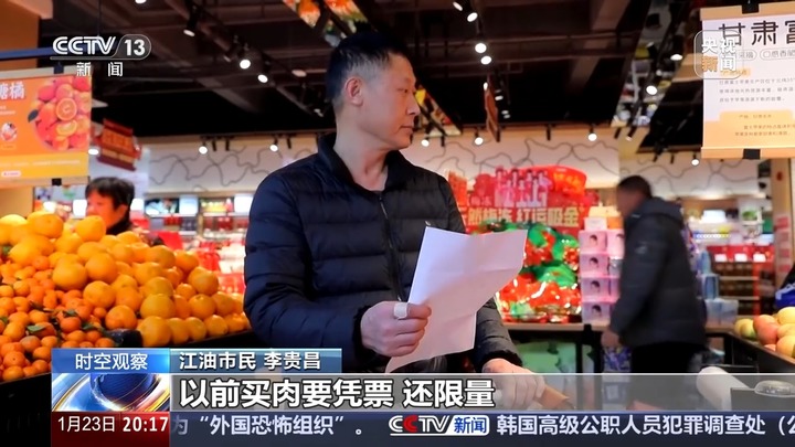 江油市民 李贵昌:今天来买点肉、水果、零食之类的,以前买肉要凭票,还限量,现在想买多少就是多少。