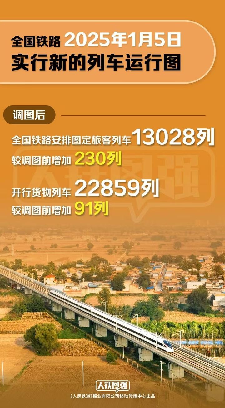 记者从中国国家铁路集团有限公司获悉,1月5日零时起,全国铁路实行新的列车运行图,安排图定旅客列车13028列,较调图前增加230列;开行货物列车22859列,较调图前增加91列,铁路客货运输能力、服务品质和运行效率进一步提升。
