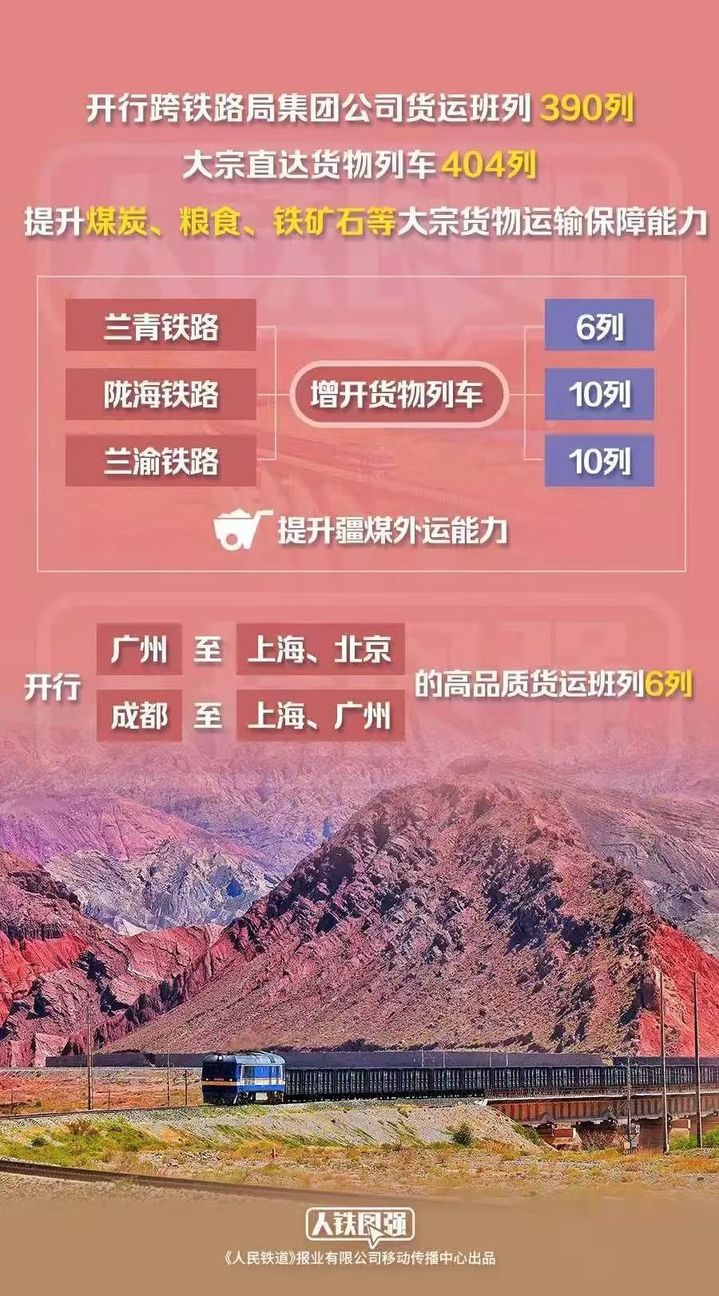 货运方面,铁路部门统筹运用线路、场站资源,安排开行跨铁路局集团公司货运班列390列,大宗直达货物列车404列,提升煤炭、粮食、铁矿石等大宗货物运输保障能力,为冬季能源保供和国民经济平稳运行提供有力支撑。其中,优化调整兰州铁路枢纽列车运行方案,兰青、陇海、兰渝铁路分别增开货物列车6列、10列、10列,提升疆煤外运能力。适应货运市场需求,优化货运班列产品供给,开行广州至上海、北京,成都至上海、广州的高品质货运班列6列,串联京津冀、长三角、粤港澳大湾区、成渝地区等主要经济区域,打造快捷物流产品示范线。