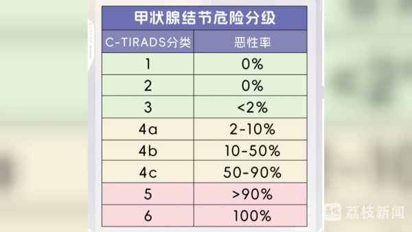 医学上,甲状腺结节是有危险分级的,分数越高,风险也越大。但也别紧张,这不意味着一定要动手术,且甲状腺良性结节一般不会癌变。江苏省省级机关医院内分泌科主任唐伟说:“一般来说3类结节以下,恶性的可能性就比较小。如果达到了4a、4b、4c,甚至达到了5级,恶性的可能会逐渐增高。但这只是超声特征性描述,并不等于判断为恶性。”