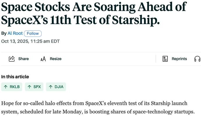 △美国知名财经杂志《巴伦周刊》报道,“星舰”第11次试飞前,太空股飙升