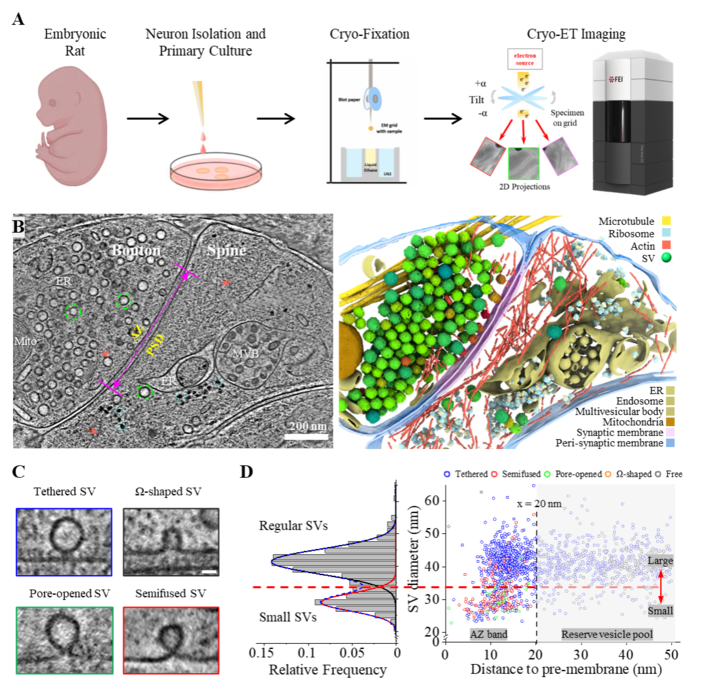 基于上千套高分辨率三维结构数据的系统分析,团队发现囊泡释放与快速回收是一个可分为三阶段的动态过程:囊泡首先与突触前膜形成纳米级融合孔(“亲吻”),随后迅速收缩为表面积减半的小囊泡(“收缩”),最终大部分囊泡以“逃逸”方式回收,少数发生“全融合”。