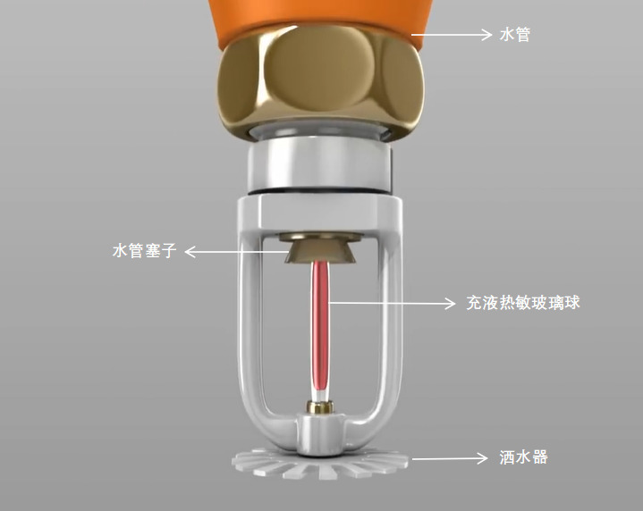 火灾发生时,起火部位燃烧反应逐渐加剧,大量高温烟气或火焰辐射温度向顶棚传递,一旦达到热敏玻璃球的额定工作温度,其内部液体将迅速反应膨胀,使玻璃球破裂,从而自动开启喷淋。