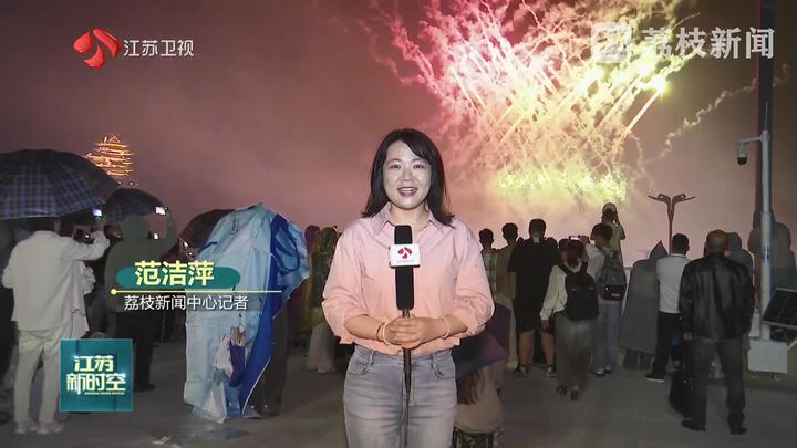 荔枝新闻中心记者范洁萍说:“这里是江苏园博园的星空剧场。10月1日晚,一场国庆主题烟花秀在这里拉开帷幕。烟花和无人机在空中组成绚烂的图案,带领游客朋友们开启不一样的假日狂欢。”