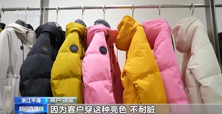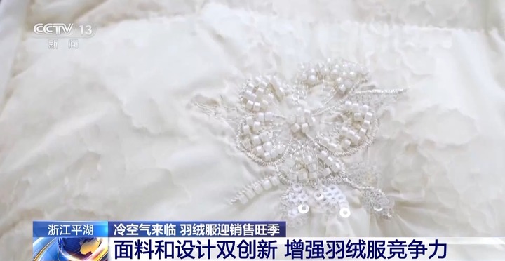 在浙江嘉兴平湖的一个服装销售市场,羽绒服的销售战从面料竞争开始。这家店铺在最打眼的位置展示了一件采用蕾丝覆膜面料的羽绒服。蕾丝是女装常见的元素,但用在羽绒服上比较难以打理,在蕾丝外面覆膜很好地解决了这个麻烦。此外,店里还推出了羊毛面料等多种款式的产品,吸引了不少采购商的目光。