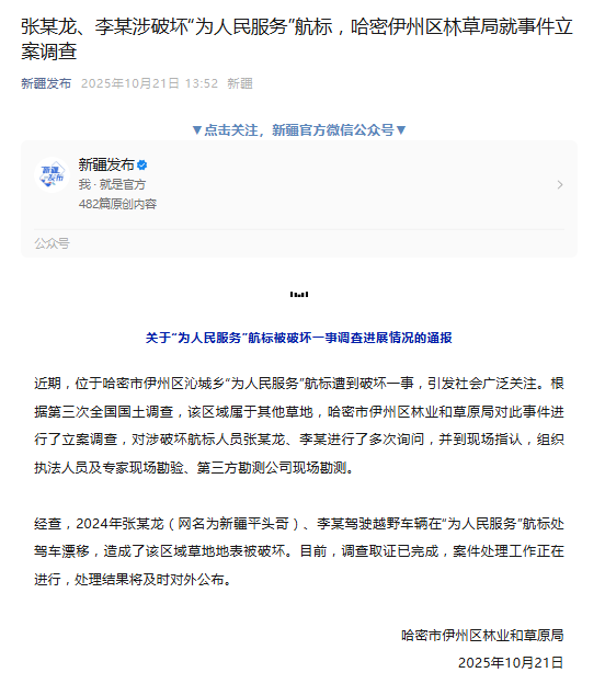 张某龙、李某涉破坏“为人民服务”航标,哈密伊州区林草局就事件立案调查