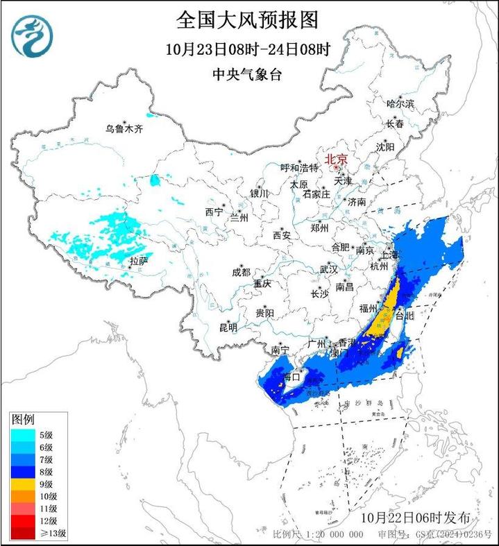 10月23日8时至24日8时,西藏中北部、青海西南部、福建东部、广东南部、广西南部、海南岛等地部分地区有5~6级风,阵风7~8级;东海大部海域、台湾海峡、台湾以东洋面、巴士海峡、北部湾、南海北部和中西部海域将有7~8级、阵风9~10级的大风,其中东海西南部海域、台湾海峡、巴士海峡、海南岛西南部海域风力可达9~10级、阵风11级。