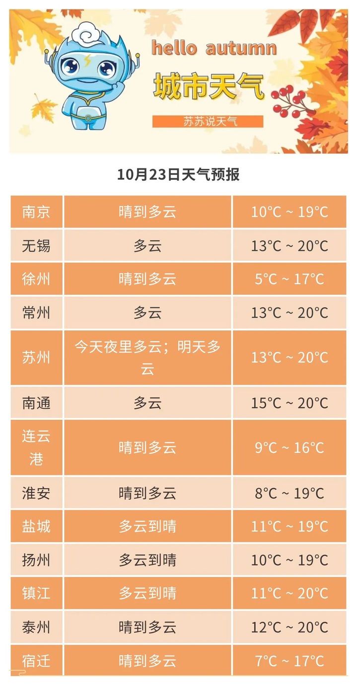 全省多云到晴。最高温度:淮北地区16~17℃,苏南地区20~21℃,其他地区19℃左右;最低温度:本省西北部地区7~8℃,东南部地区15~16℃,其他地区11℃左右。全省偏北风,风力:本省西北部3-4级,其他地区4-5级阵风6-7级。