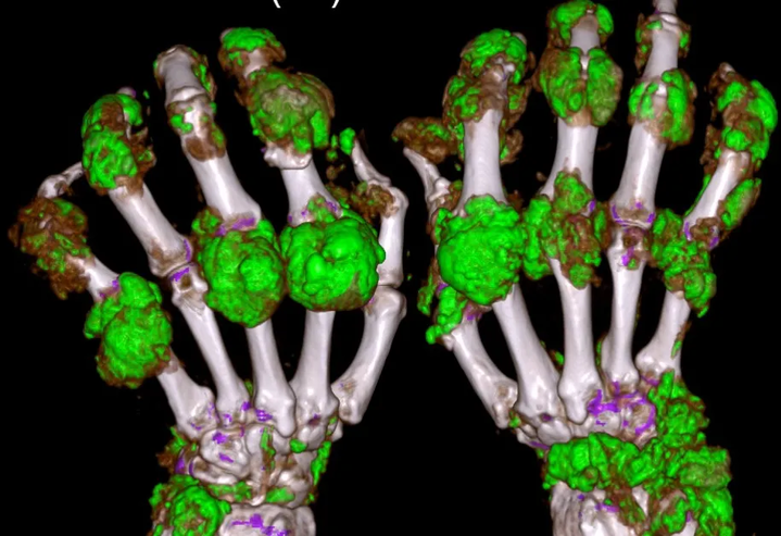 在家人的催促和陪伴下,刘大爷来到了南京市第一医院风湿免疫科主任、博士生导师车楠的专家门诊。通过检查发现,刘大爷尿酸值604umol/L,除了满身痛风石,他还查出了高血压、慢性肾功能不全、高脂血症,双肾里还藏着好几颗小结石,血沉和C反应蛋白也偏高,这说明他身体里的炎症就没停过。