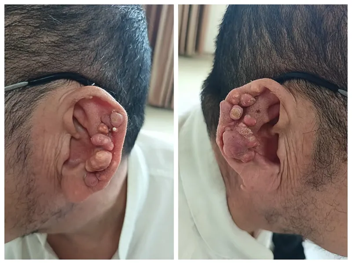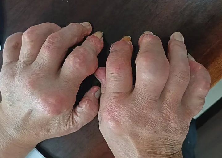 随着时间推移,刘大爷身上已是“石”痕累累:双手、双脚、膝关节上鼓满了硬邦邦的痛风石,甚至连耳朵上都能摸到凸起的小疙瘩,活像长了串小石子。