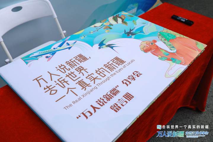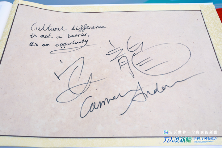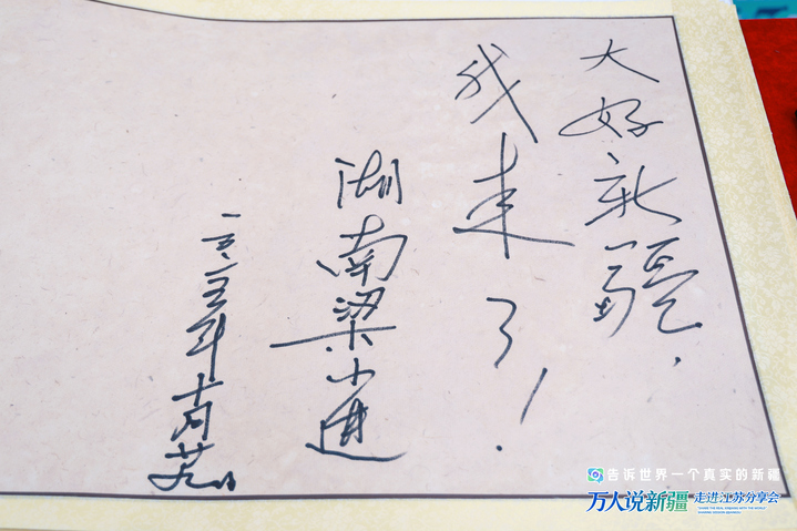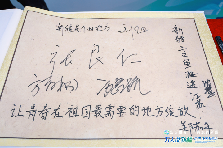 会场入口处,有一本装帧精美且特殊的留言册,来自天南地北的嘉宾在此签名留念,写下对新疆的祝福——