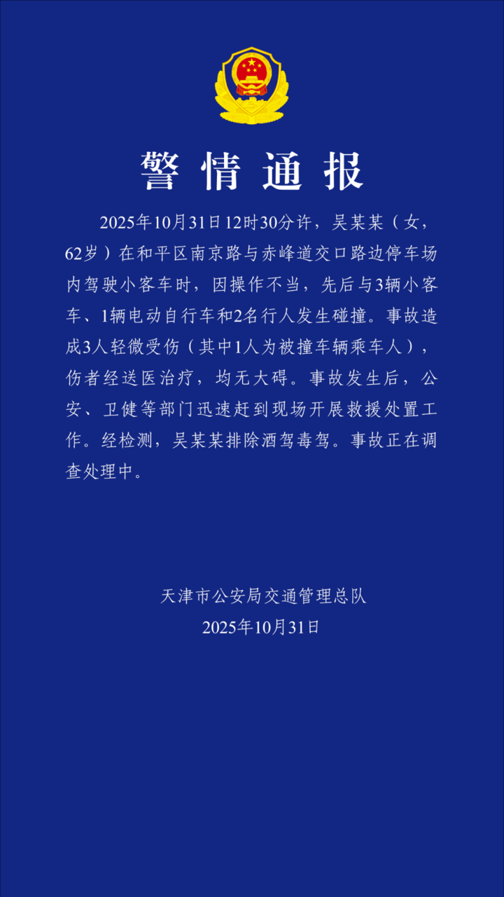 荔枝新闻讯 天津交警通报,10月31日12时30分许,吴某某(女,62岁)在和平区南京路与赤峰道交口路边停车场内驾驶小客车时,因操作不当,先后与3辆小客车、1辆电动自行车和2名行人发生碰撞。事故造成3人轻微受伤(其中1人为被撞车辆乘车人),伤者经送医治疗,均无大碍。事故发生后,公安、卫健等部门迅速赶到现场开展救援处置工作。经检测,吴某某排除酒驾毒驾。事故正在调查处理中。