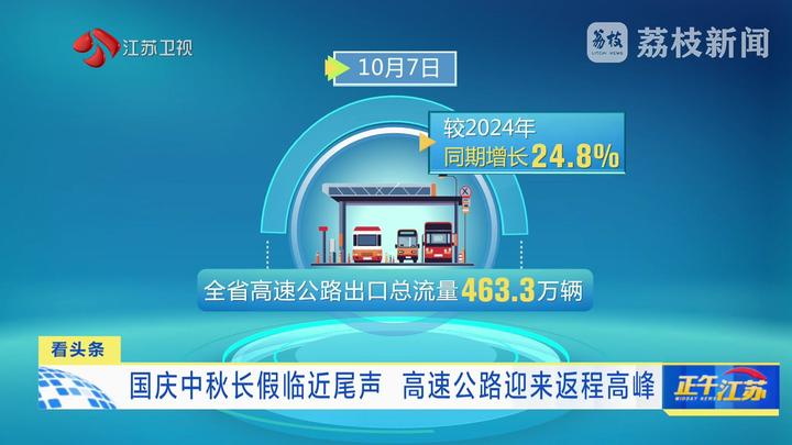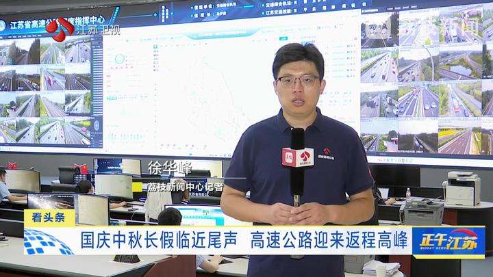 荔枝新闻中心记者徐华峰说:“国庆中秋长假的最后一天,江苏省高速公路调度指挥中心的大屏显示,上午10点左右,江苏高速公路的多个路段已出现车辆缓行的状态。”