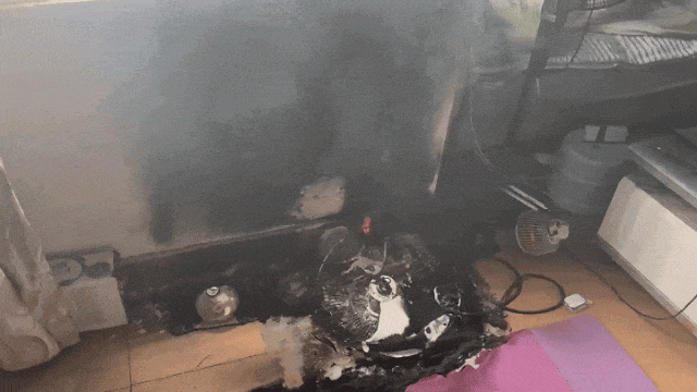 江西赣州市一居民在家中使用“小太阳”取暖器时,离开时未关闭电源,经长时间烘烤,取暖器引燃周边物品,房间内传出浓烟,被日常巡查的消防员发现。