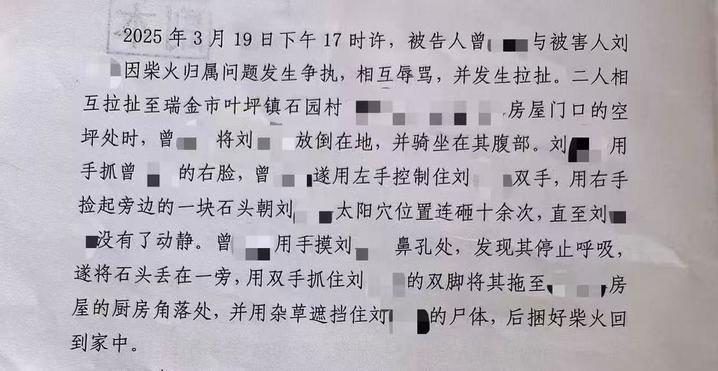 起诉书显示,曾某某左手控制被害人双手,右手捡起石头砸向被害人太阳穴位置,连砸十余次。案发时的一个细节,让毛女士深感气愤:“曾某某在把我妈妈杀害掉后,还在搬走我妈妈的柴火……”