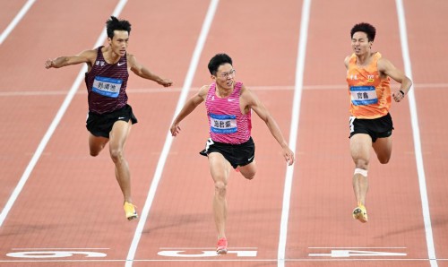 11月19日,辽宁队选手孙清池、广东队选手施君豪、重庆队选手官鑫(从左至右)在田径男子200米决赛中冲线。新华社记者 邓华 摄
