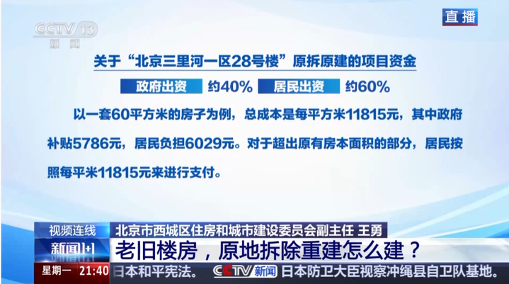 王勇介绍,北京市西城区“三里河一区28号楼”原拆原建项目主要依据北京市住建委等几个部门联合出台的《关于开展危旧楼房改建试点工作的意见》。